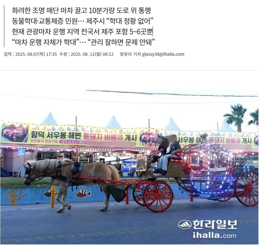 제주시 관계자는 “말마차 체험이 오후 6시부터 10시까지 운영되고, 운영 중 충분한 휴식 제공과 물 공급을 확인했다”며 “동물보호법상 동물학대에 해당되지 않는다. 운영자에게는 꾸준한 관리와 동물보호법 기본 원칙 규정을 안내했다”고 했다