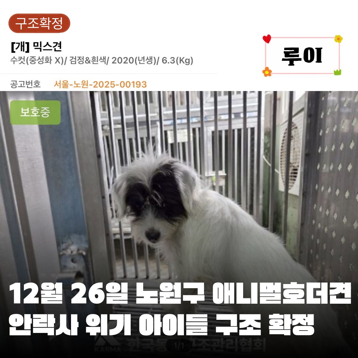 오늘은 이 3명의 아이들에 대해 시민들에게 알리고자 합니다. 3명은 애니멀호더견 208마리에 함께 생활하던 아이들이었습니다. 11월 13일 1차 구조때 구조된 아이들입니다. 서울시와 노원구에서 진행한 중성화 수술 후 2주 가정임보제 진행으로 가정 임보를 갔다가 입질과 심장사상충이 있다는 이유로 되돌아오게 되었습니다. 하지만 되돌아간 곳은 서울시와 노원구 센터가 아닌 동물구조관리협회였습니다.